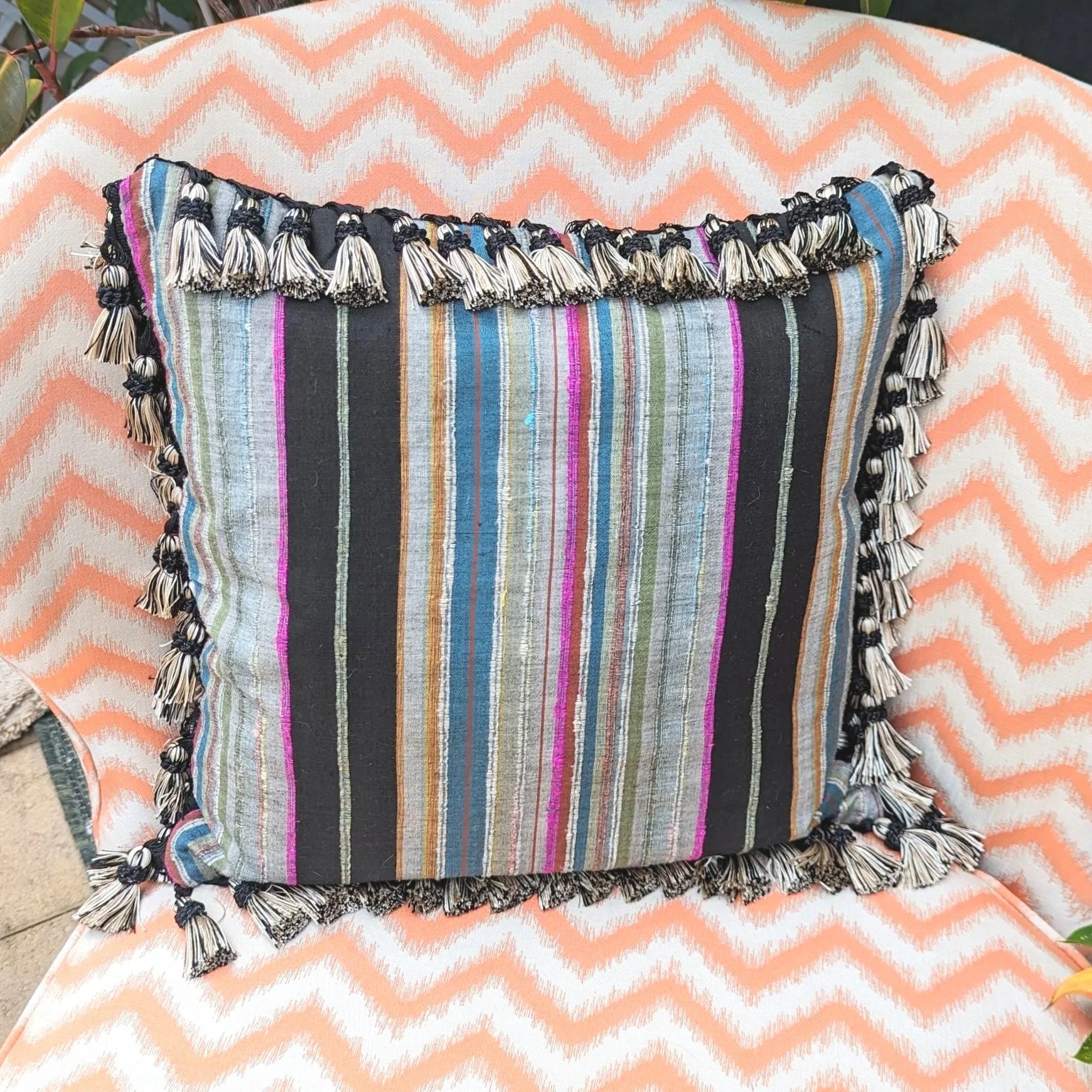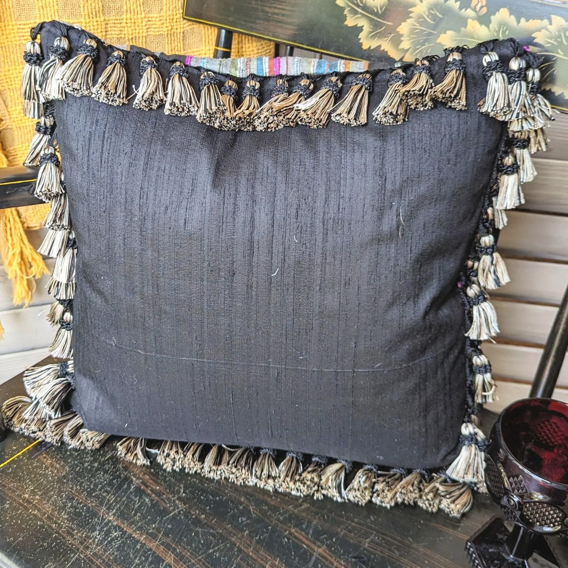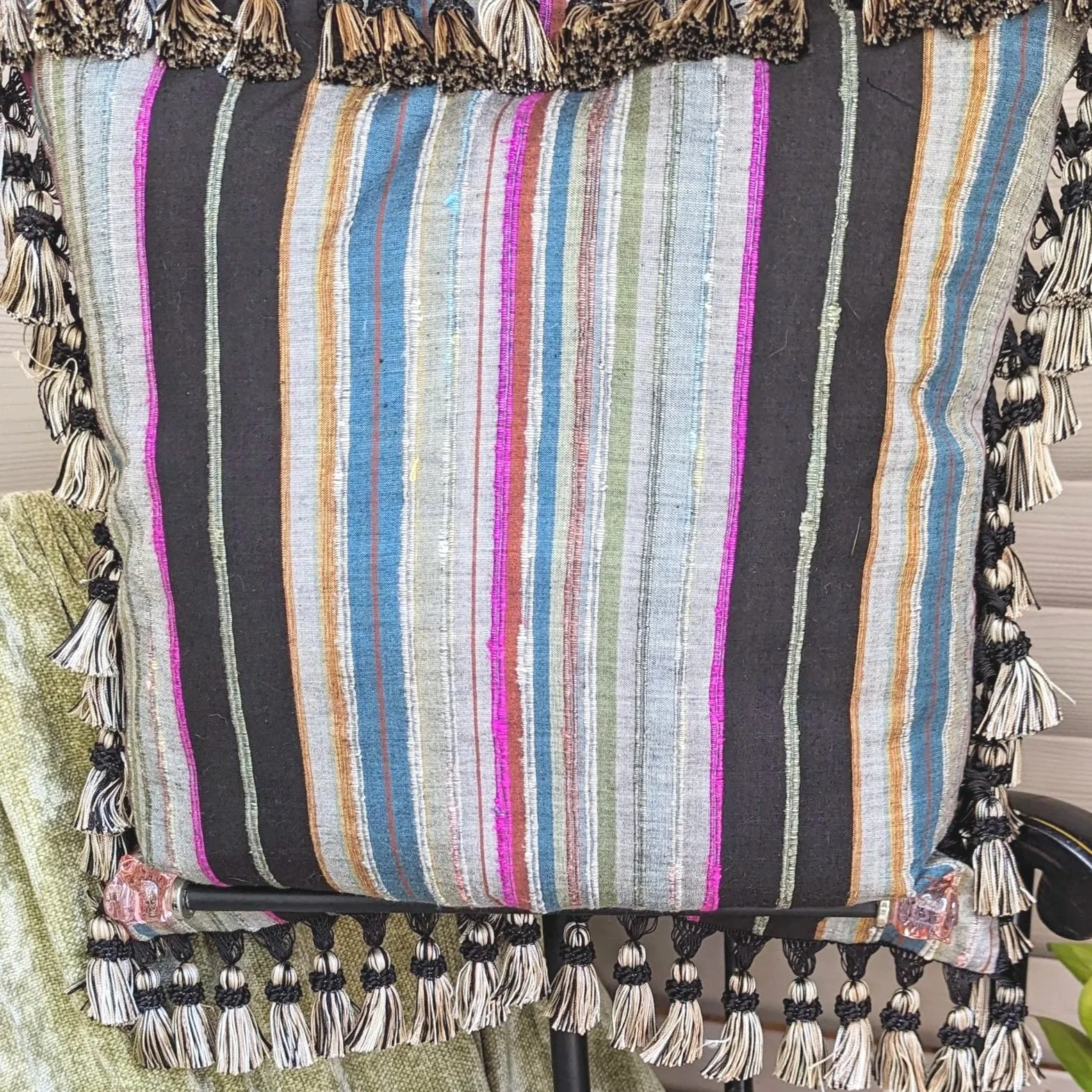 Madras Striped Silk Throw Pillow Featuring Black, Turquoise, Gold, And Fuchsia Pink With Tassel Trim, Handmade In The USA