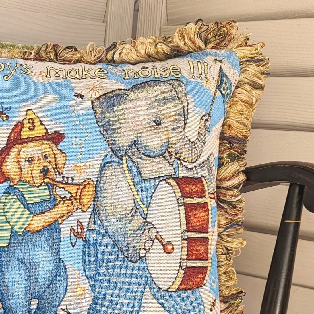 Children’s Throw Pillow With Fringe Tassel Accent For Boys Nursery Bedroom Featuring An Animal Marching Band With A Whimsical Elephant, Rabbit, And Puppy